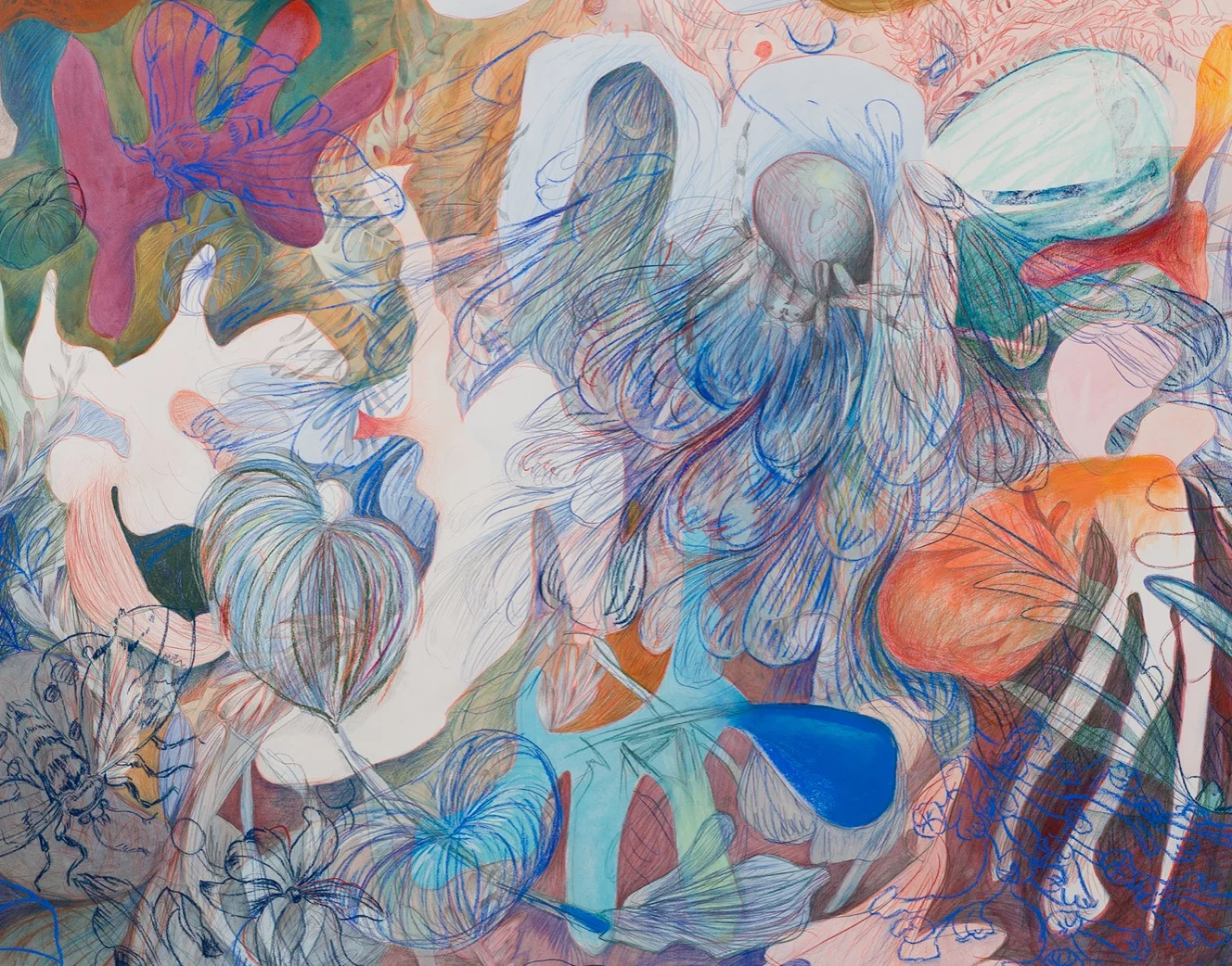 This work on paper by Sarah Davidson was recently acquired by one of our clients. Working between drawing and painting, Davidson creates shadowy, biomorphic compositions. Her tangled and fragmented imagery references plants and the natural world while confronting Western notions of biological study as observation. Overlapping silhouettes synthesize a web of different perspectives that references Davidson’s own thoughts on the study of nature.